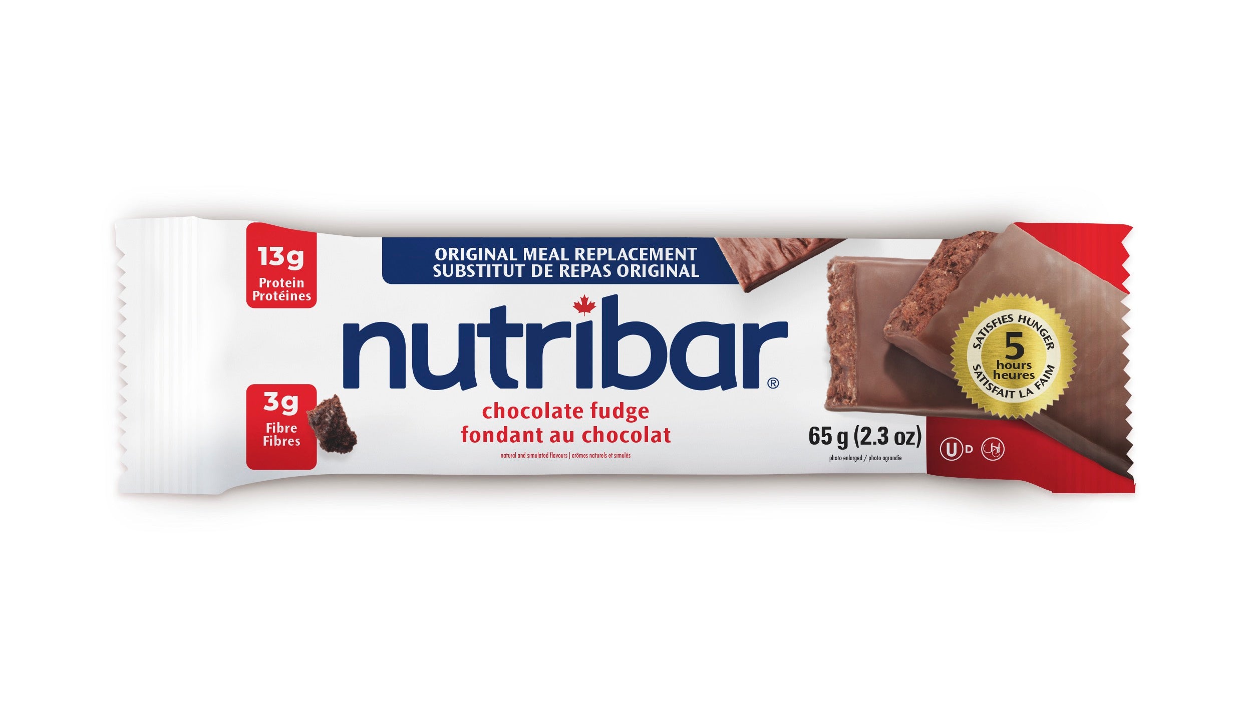 Primary ingredients: Sugars (glucose-fructose, rice syrup and grape juice blend, honey, maltodextrin), Protein blend (soy protein isolate, modified milk ingredients, milk protein), Dark chocolate flavoured coating [sugar, modified vegetable oil (palm, palm kernel), cocoa powder (cocoa, potassium carbonate), soy lecithin, natural vanilla extract], Crisp rice [rice meal, rice flour, dextrose, sugar, salt], Cocoa powder, Sorbitol, Semisweet chocolate chips (sugar, unsweetened chocolate, cocoa butter, soy lecithin, vanilla extract), Soy lecithin, Soybean oil, Inulin, Ground brown flax seed, Glycerin, Salt, Natural and artificial flavours, Oat fibre.